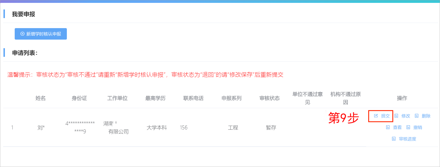 说明:学时申报信息保存后,在点击提交前,可进行修改。点击提交后,申报信息无法修改,可点击"撤销"或后续审核流程退回后可修改重新提交。