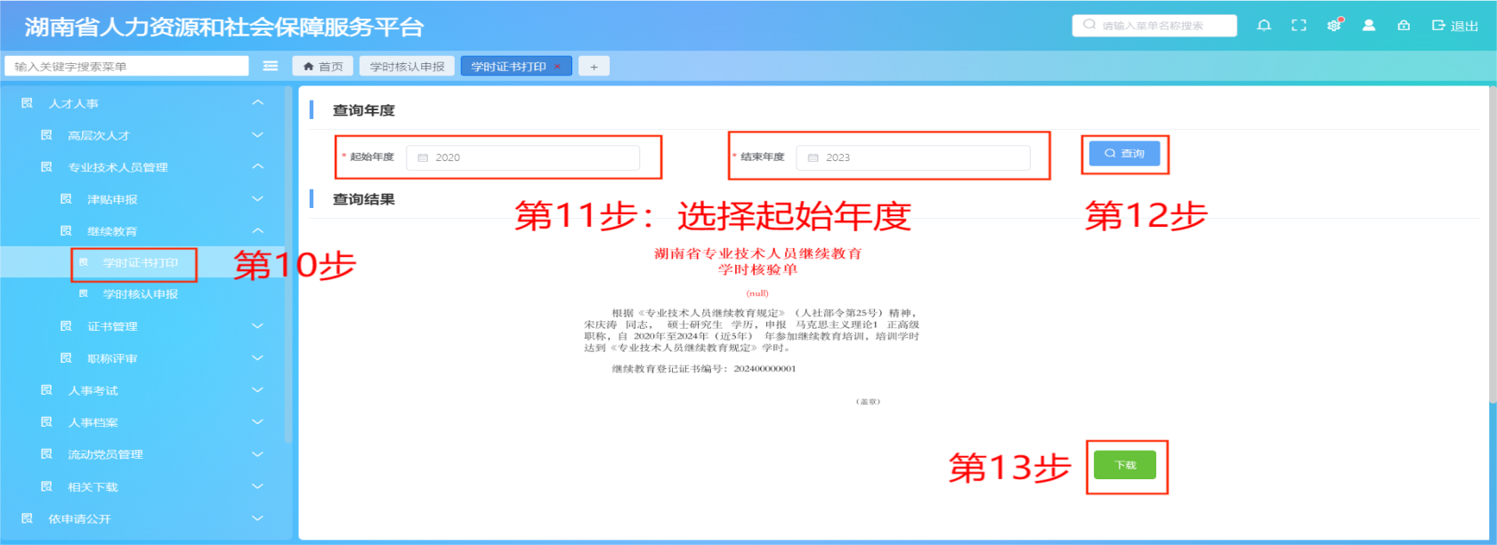 学时审核通过后,第10步:点击"学时证书打印"。第11步:选择所需的起始年度。第12步:点击"查询"。第13步:点击下载,下载保存学时认定单。