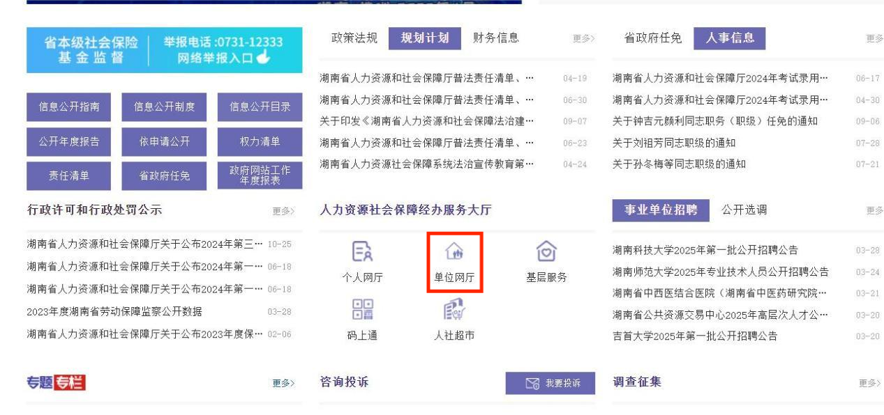 登录湖南省人力资源社会保障厅官网(//rst.hunan.gov.cn),点击"单位网厅"登录单位管理员账号。