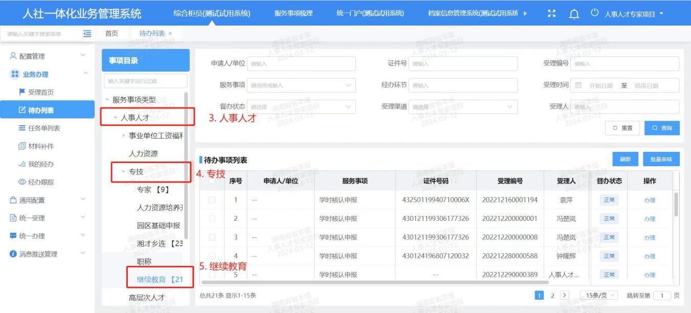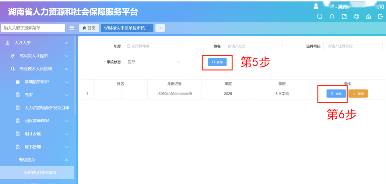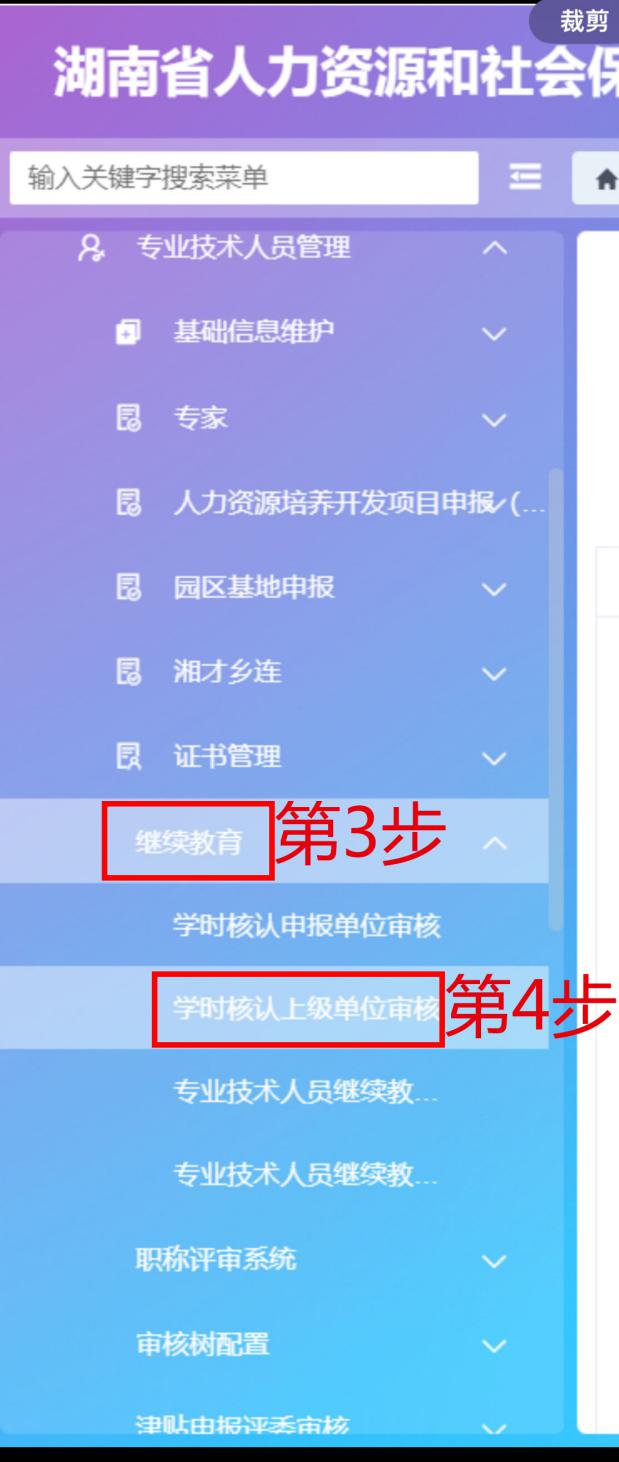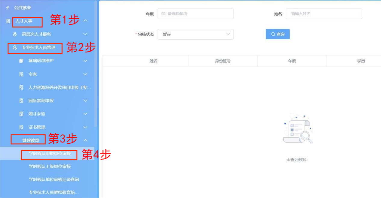 第1步:点击"人才人事"。第2步:点击"专业技术人员管理"。第3步:点击"继续教育"。第4步:点击"学时核认上级单位审核"。
