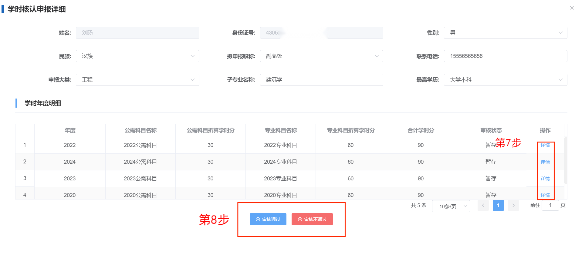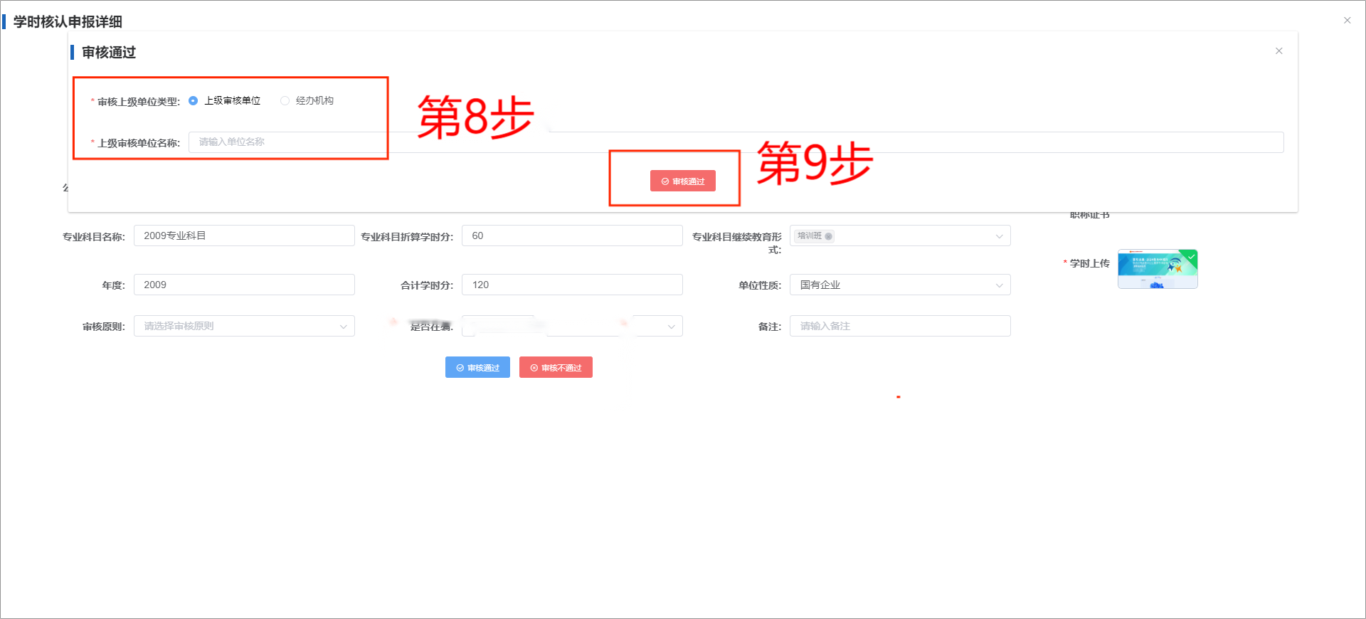 第7步:点击"详情",查看单位职工上传的学时材料,对照文件审核职工所申报的学时。第8步:符合要求点击"审核通过",不符合要求点击"审核不通过",并说明原因。