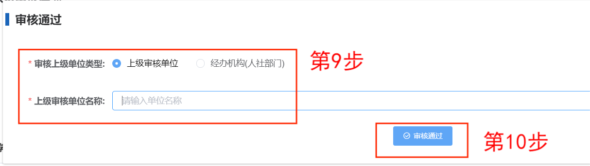 第9步:选择上级审核单位,填写并正确选择上级单位。一级单位直接选择经办机构(经办机构指人社部门)。第10步:点击"审核通过"。