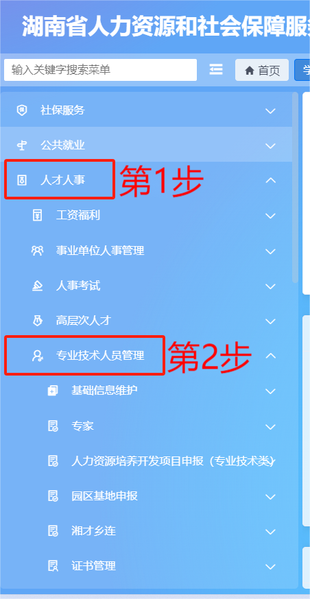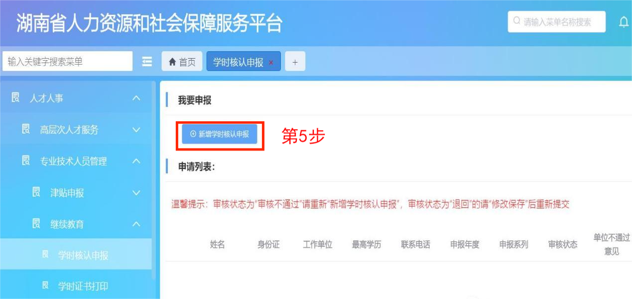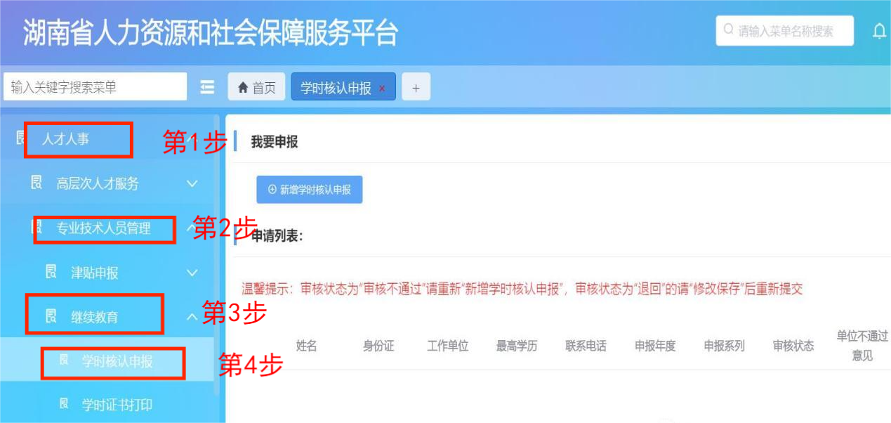 第1步:点击"人才人事"。第2步:点击"专业技术人员管理"。第3步:点击"继续教育"。第4步:点击"学时核认申报"。
