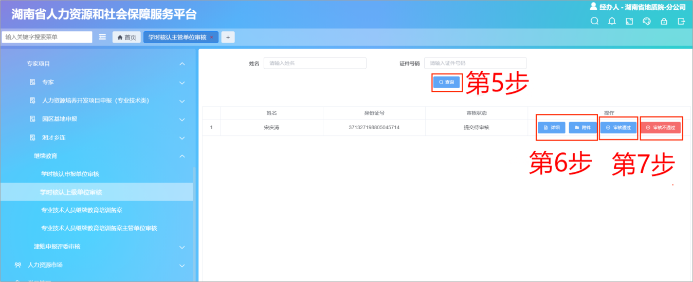 第5步:点击"查询",查询下级单位职工申报信息。第6步:查看单位职工上传的学时材料,对照文件审核职工所申报的学时。第7步:不符合要求点击"审核不通过",并说明原因。符合要求点击"审核通过",进入下一步。