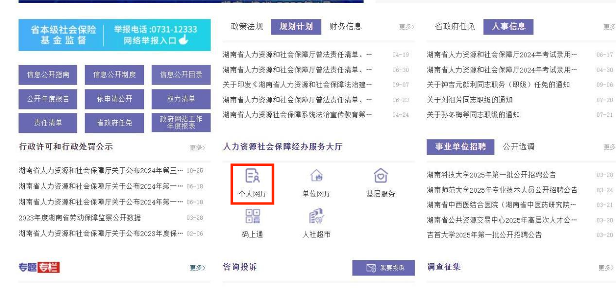 登录湖南省人力资源社会保障厅官网(//rst.hunan.gov.cn),点击"个人网厅"登录个人账号。