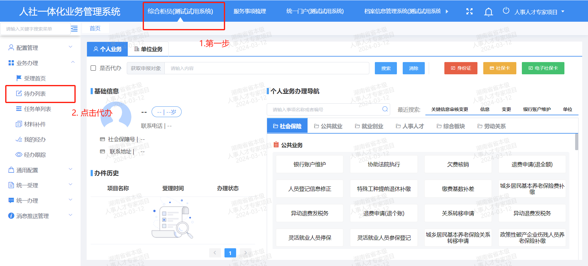 登录人社一体化平台账号,第1步:点击"综合柜员"。第2步:点击"待办列表"。
