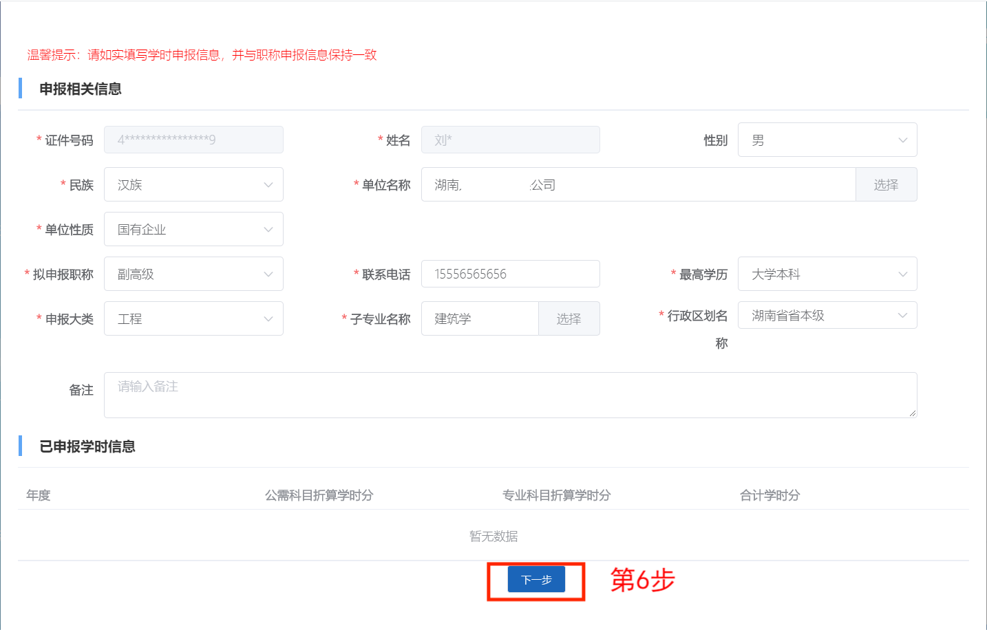 第6步:如实填写学时申报信息,所有带"*"的内容都必须填写,点击"下一步"。