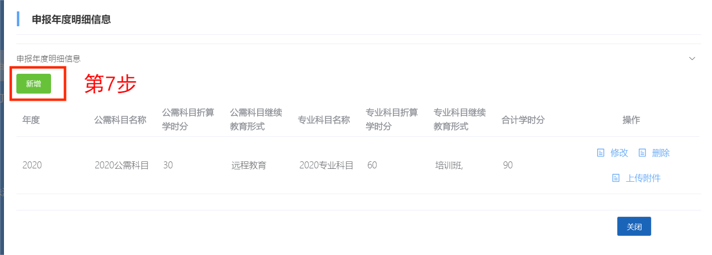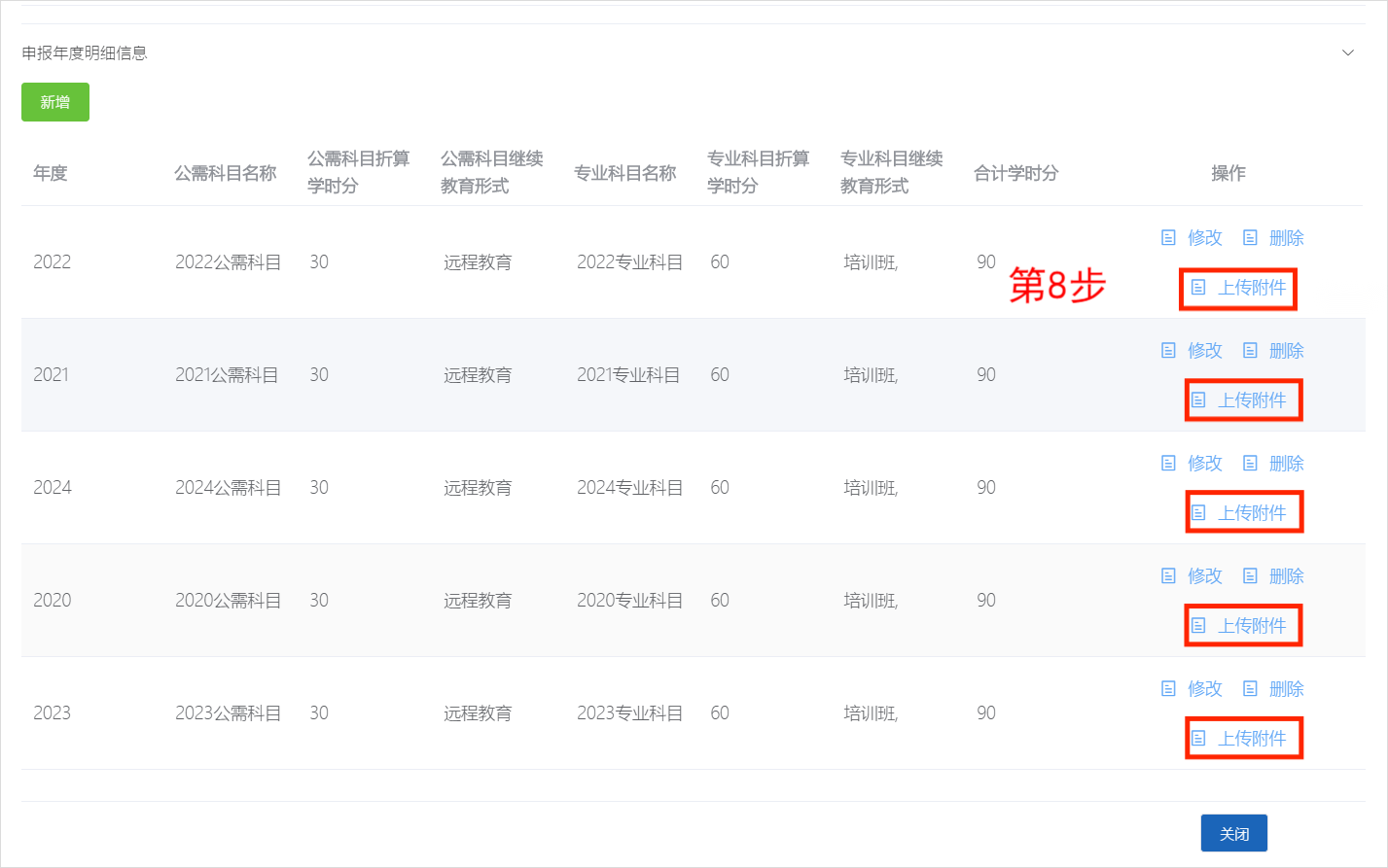 第8步:新增所需年度的学时申报信息,点击"上传附件",按要求上传对应年度相关材料。